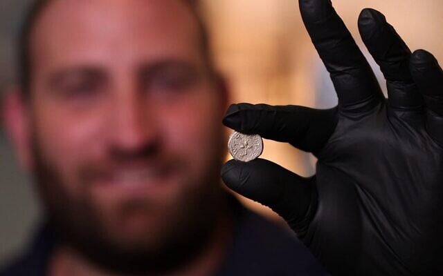 Yaniv David Levy, a scholar from the Israel Antiquities Authority, showing a 2,000-year-old Judean coin from the first year of the Jewish Revolt against the Romans (Photo credit: Emil Aladjem/Israel Antiquities Authority)